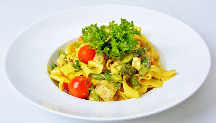 Gemischter Salat mit Spargel und gegrillter Putenbrust, Baguette