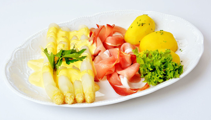 Frischer Spargel (ca. 180g) mit geklärter Butter oder Sc. Hollandaise und Salzkartoffeln, variiert mit: